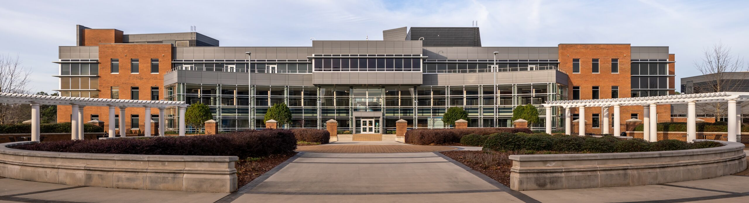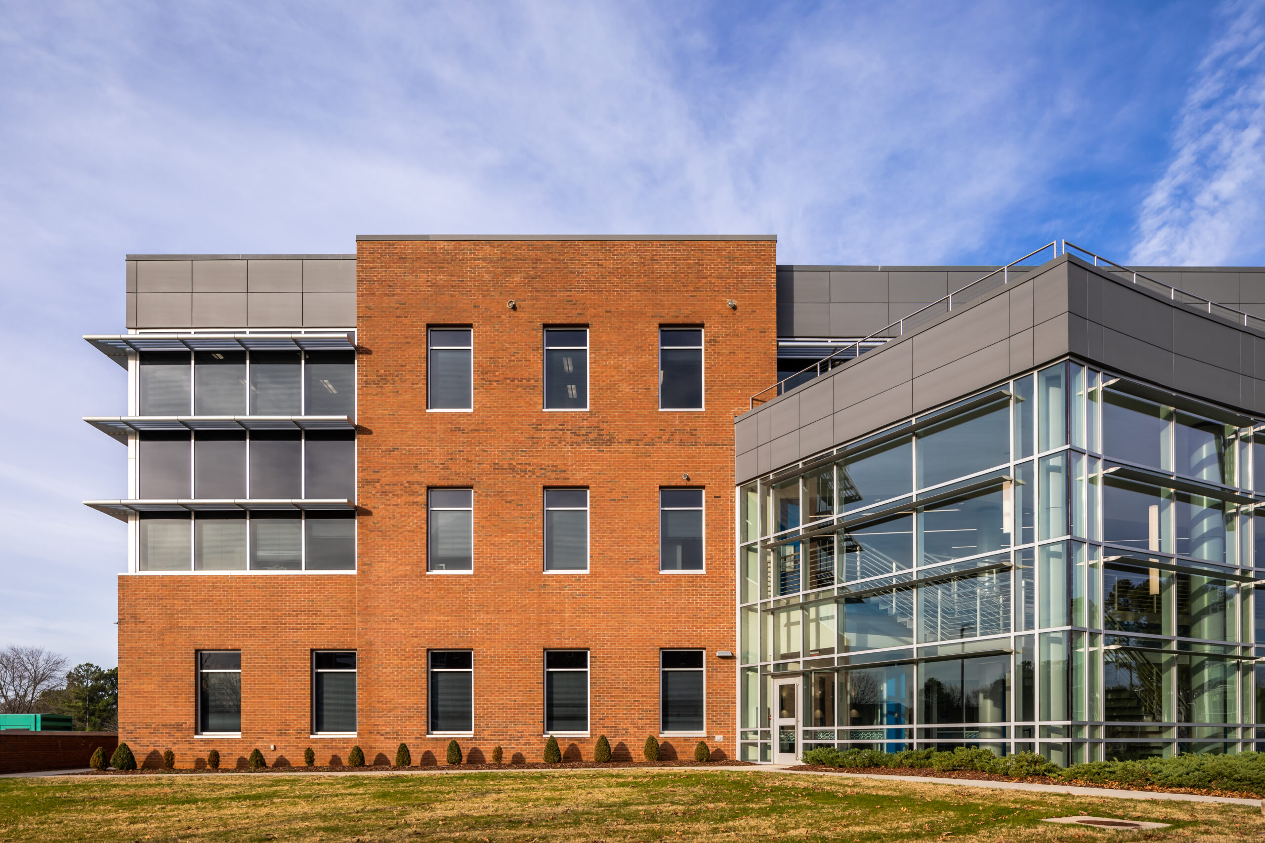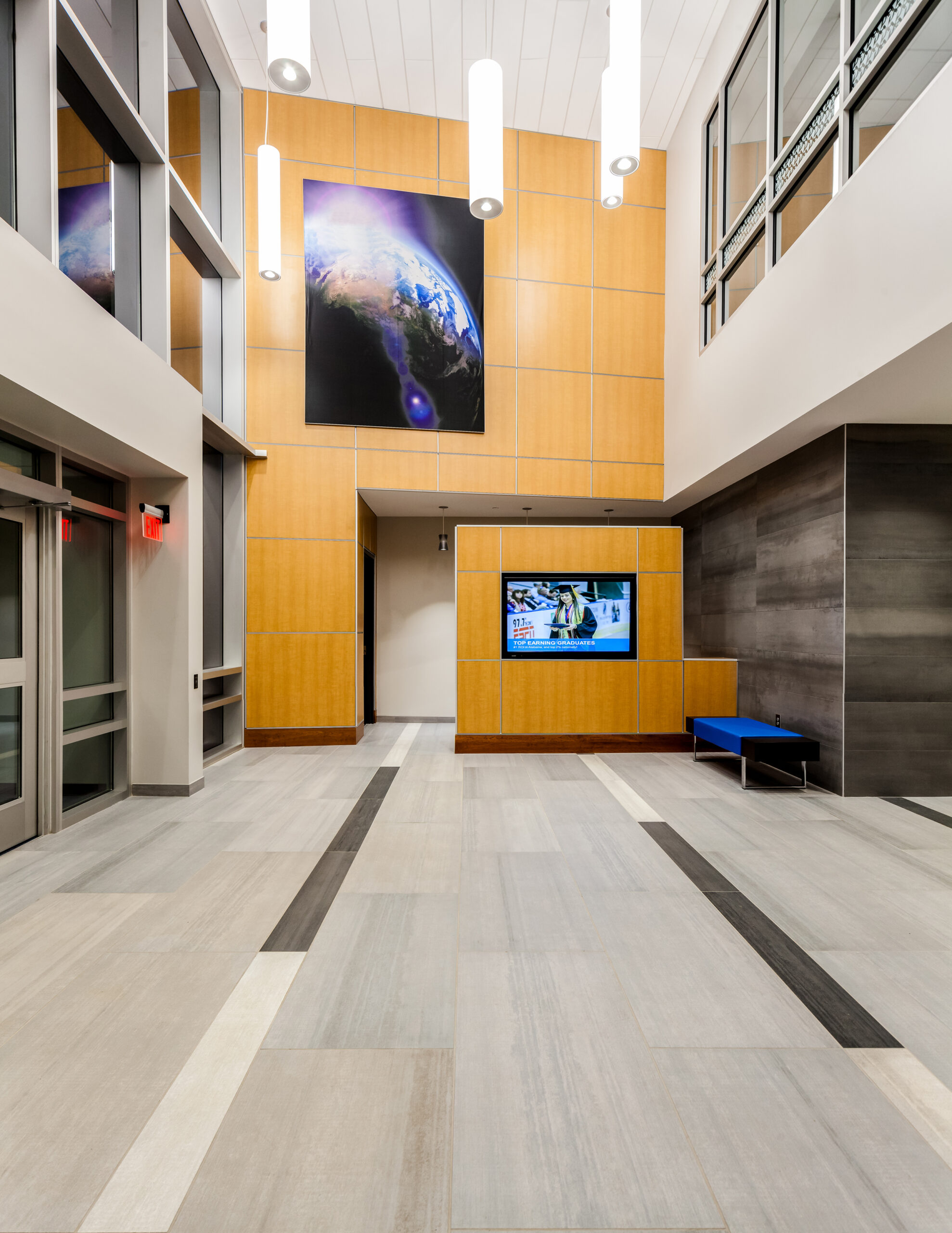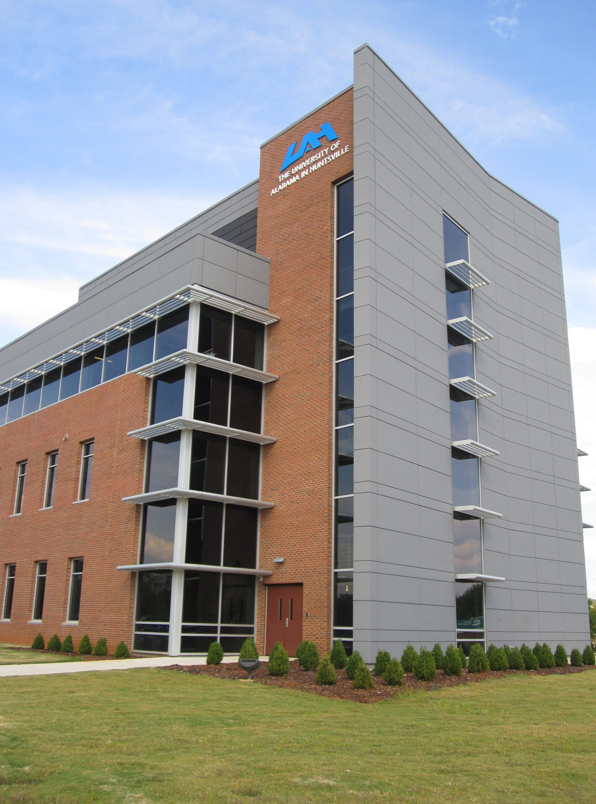 The building is a campus focal point for a small university with an emphasis on technology and aerospace research and development. The building completes the architectural definition of a central campus greenway. The curved glass atrium is concentric with an existing circular plaza that marks the exact center of campus. The central axis of the building relates to an important pedestrian access way defined by two residence halls on the opposite side of the greenway. The splayed walls of the entrance side greet and embrace visitors approaching from the parking lot and vehicle drop-off side.