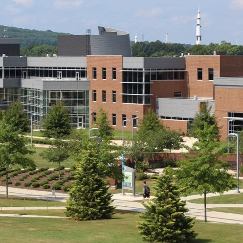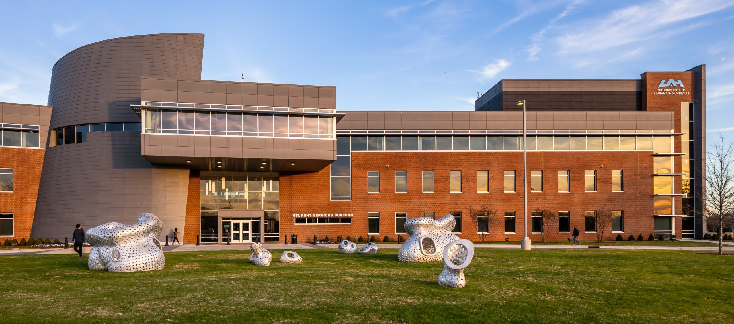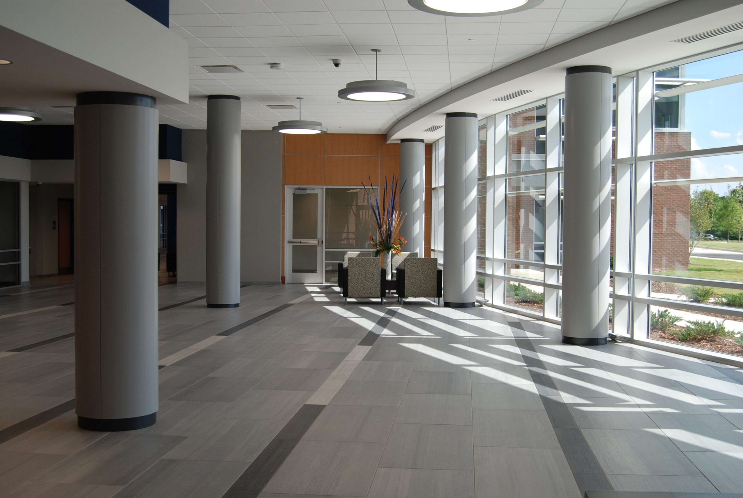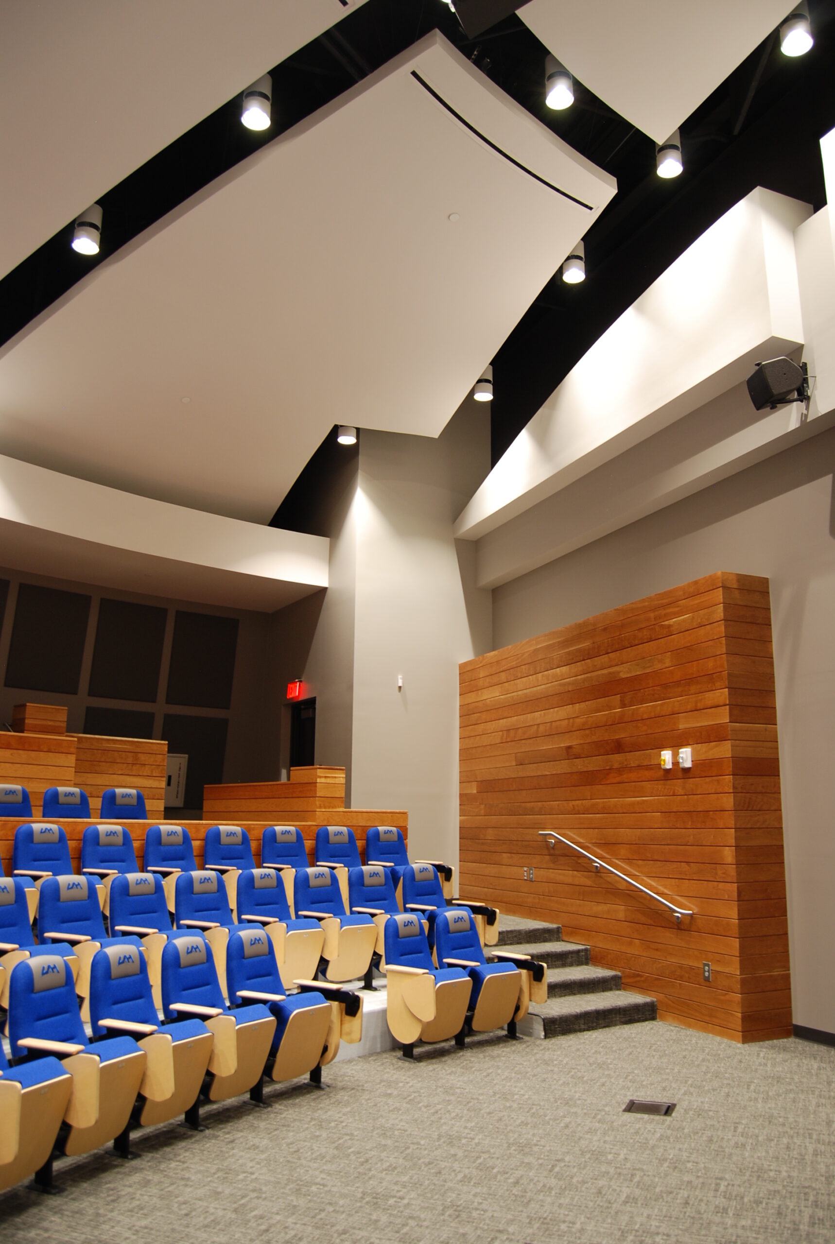 The building is a campus focal point for a small university with an emphasis on technology and aerospace research and development. The building completes the architectural definition of a central campus greenway. The curved glass atrium is concentric with an existing circular plaza that marks the exact center of campus. The central axis of the building relates to an important pedestrian access way defined by two residence halls on the opposite side of the greenway. The splayed walls of the entrance side greet and embrace visitors approaching from the parking lot and vehicle drop-off side.