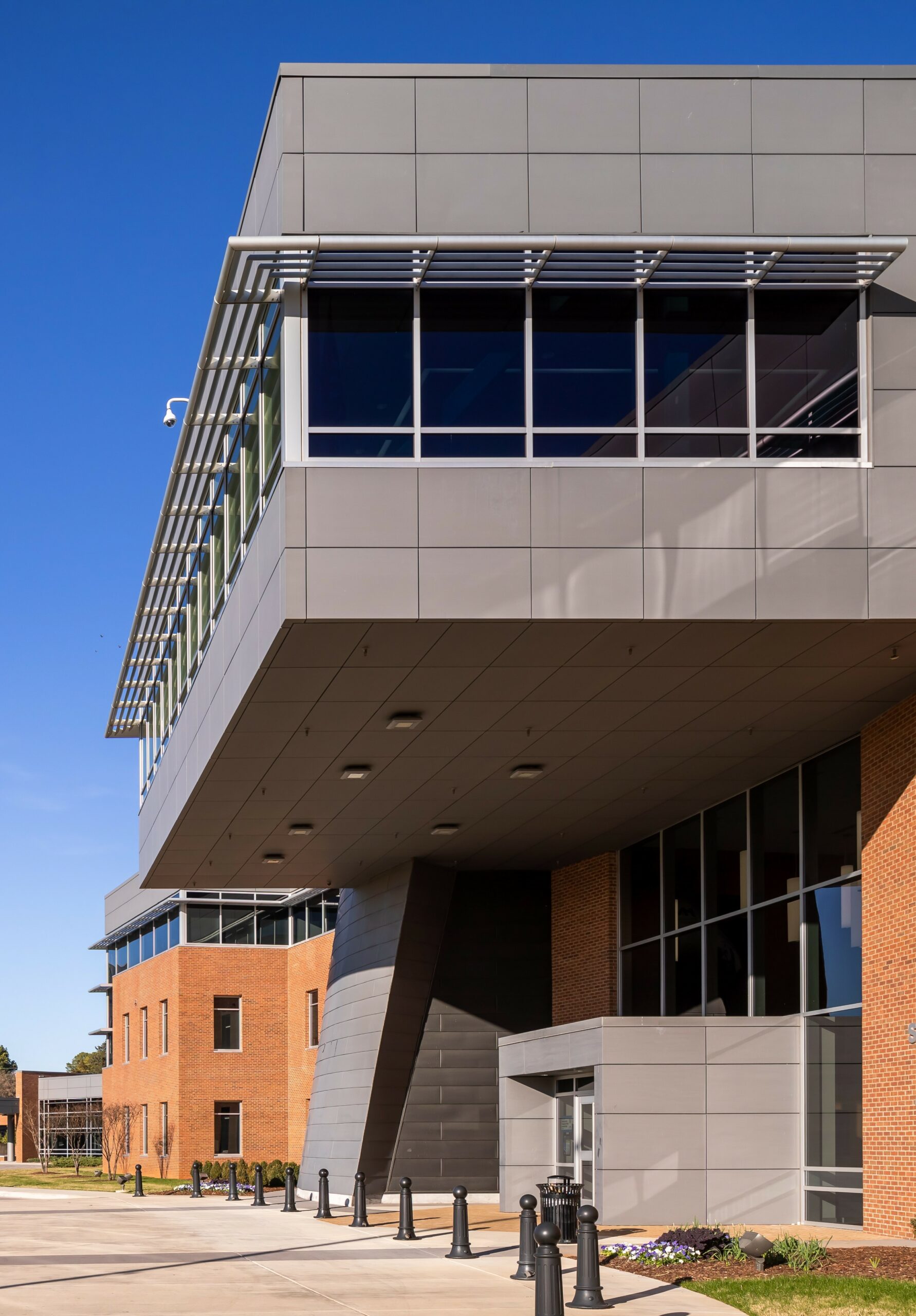 The building was designed with two primary facades and entrances – the public façade incorporates dramatic elements and the student façade curves around the pedestrian greenway.