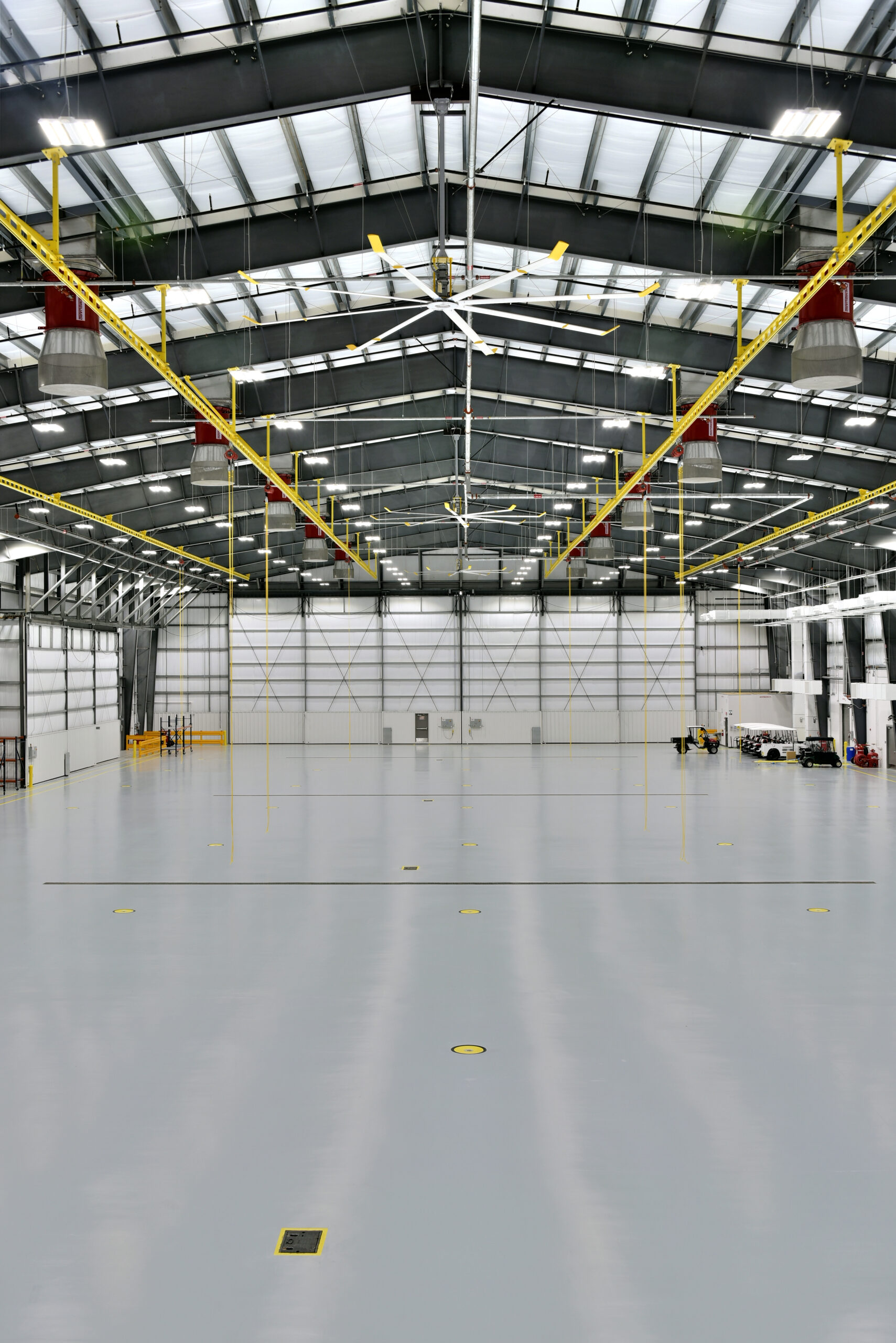 Two stories of administrative offices located at the front of the hangar create opportunities for a variety of windows in an otherwise windowless building, and the entrance canopy abstracts the company logo to bring the branding to the exterior of the building.
